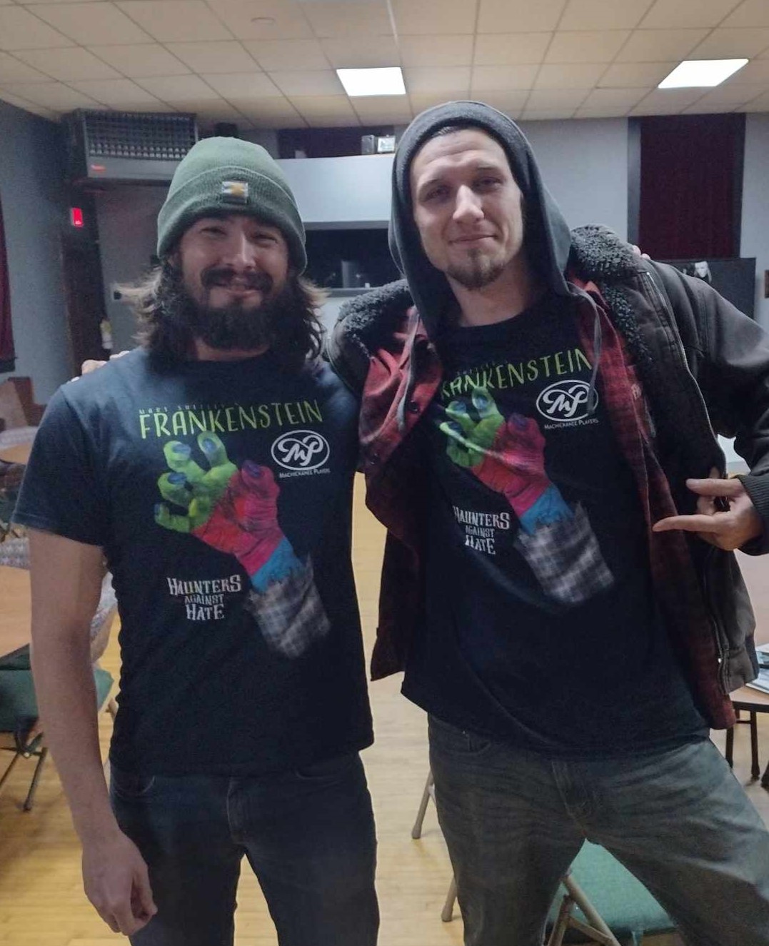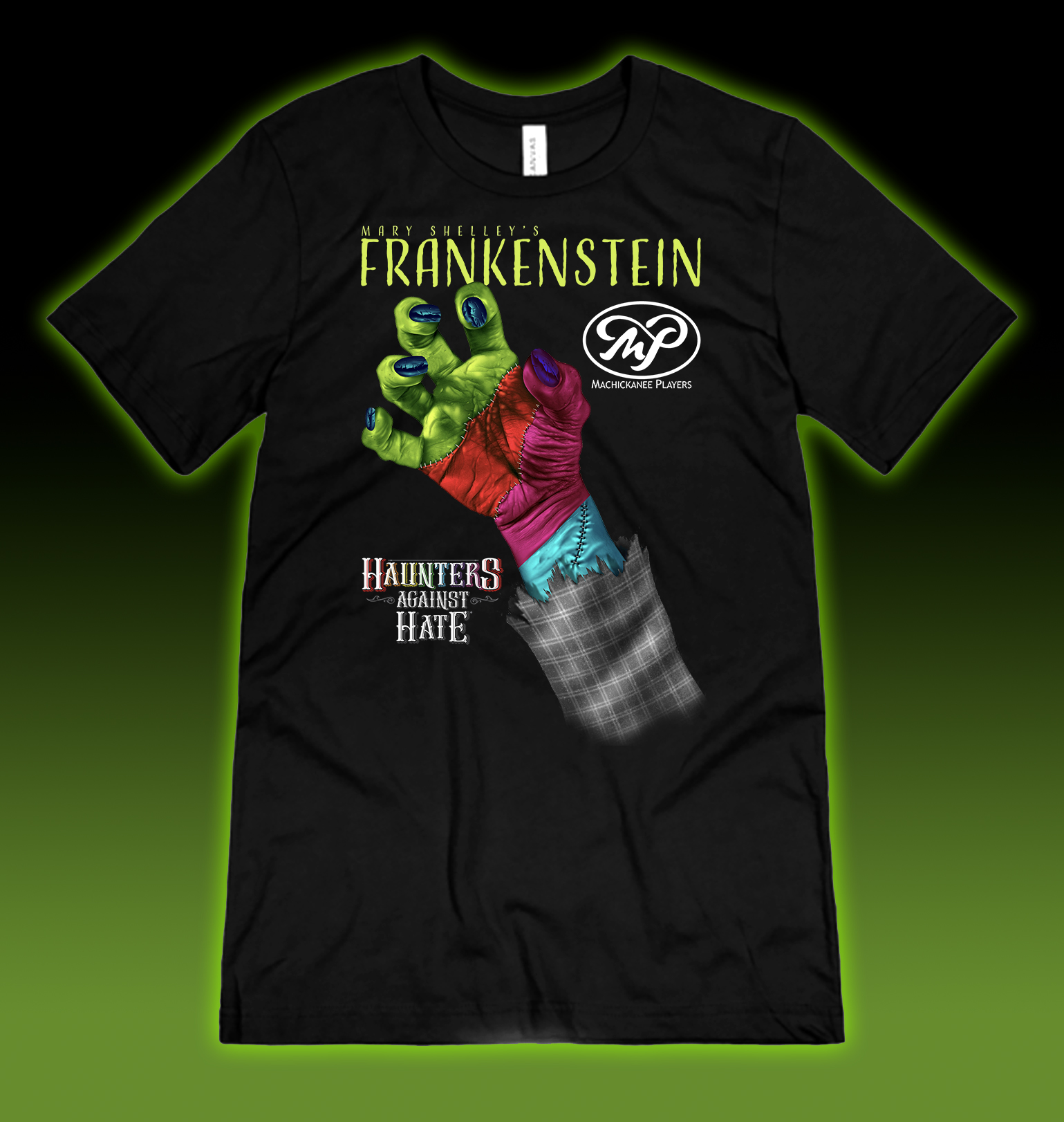 Long-time patrons are well aware that we offer dinner with some of our shows and pie with other shows. But we’re doing something new and different. We’ve collaborated with a nonprofit organization, Haunters Against Hate, to produce an exclusive shirt design that we are selling as an optional add-on with tickets for “Frankenstein”.